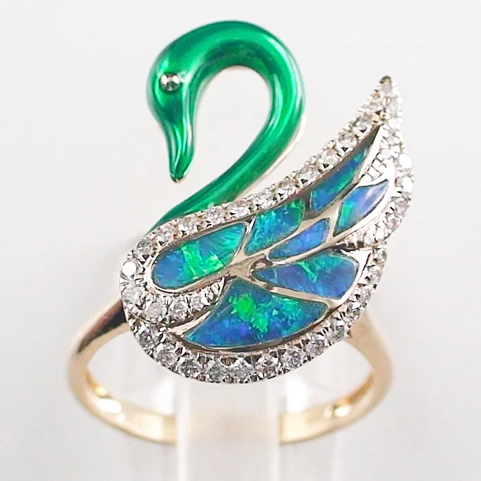 14k Gelbgold Opalring mit Black Crystal Opal Inlays und Diamanten – Extravagantes Schwan-Design mit Lightning Ridge Opalen