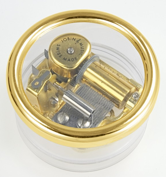 Komplett eingebaut in eine Acrylglaskapsel mit goldfarbenem Frontreif. Vielseitig verwendbar, auch für den Einbau in Dosen, Truhen,