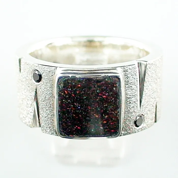 Ein außergewöhnlicher und massiver Opalring, gefertigt aus 935er Sterling Silber. Das Herzstück dieses Rings ist ein faszinierender GEM Class Fairy Boulder Matrix Opal mit einem Gewicht von 2,45 ct, akzentuiert durch zwei schwarze Diamanten. Es werden ausschließlich echte Vollopale verarbeitet. Dieser Ring, mit seinem wunderschön multicolor pinfire funkelnden Opal und den eleganten schwarzen Diamanten, ist ein wahres Unikat und ein Statement für jeden Träger.Dieser Opalschmuck ist ein perfektes, wertbeständiges Geschenk für Sie selbst oder für Ihre Liebsten. Viel Freude mit diesem besonderen Schmuckstück. Höchste Qualität in Material und Verarbeitung ist selbstverständlich. Bevor Edelsteine oder Schmuckstücke angeboten werden, wird sichergestellt, dass sie den höchsten Qualitätsansprüchen zu 100 % entsprechen. Der Opalring ist ein absoluter Blickfang. Die Farben sind in natura intensiver als auf dem Foto oder im Video.