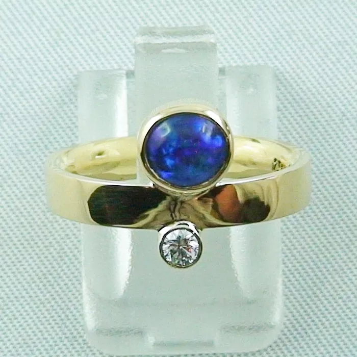 Massiver Damenring aus 750er Gelbgold 18k für die Dame, besetzt mit einem blauen Black Crystal Opal Stein und einem 0,10 ct Diamanten – Opal-Schmiede Echter massiver Geblgold-Damenring mit einem echten Black Crystal Opal. Der hier angebotene massive Goldring wurde zusätzlich mit einem Diamanten besetzt, dieser rundet das hochwertige Design ab. Der seltene blaue Opalstein strahlt in der Sonne unglaublich stark. Bestellen Sie sich noch heute Ihr persönliches massive Schmuckunikat mit einem blauen Edelstein und einem Diamanten. Der hier verwendete Black Crystal Opal hat eine sehr schöne blaue Farbe und ist sehr selten. Der Ring wird im Standard in einer Ringegröße von 53 mm angeboten, wir können den Ring jedoch individuell anpassen. Wählen Sie einfach die passende Größe aus. Die hochwertige Verarbeitung lässt keine Wünsche offen und lässt jedes Herz höher schlagen. Das angebotene massive Schmuckunikat wurde in handarbeit gefertigt. Ihnen gefällt dieses Schmuckunikat, aber Sie haben noch fragen? Wir beraten Sie zu jedem unserer Schmuckstücke persönlich. Ein eleganter massiver Opalring für die Dame aus 750er Gelbgold, besetzt mit einem dunkelblauen Opal und einem kleinen Diamanten. Ring Details Material: massiv Gelbgold 750 18k Gewicht: 5,75 Gramm Ring Innendurchmesser: 16,80 mm …