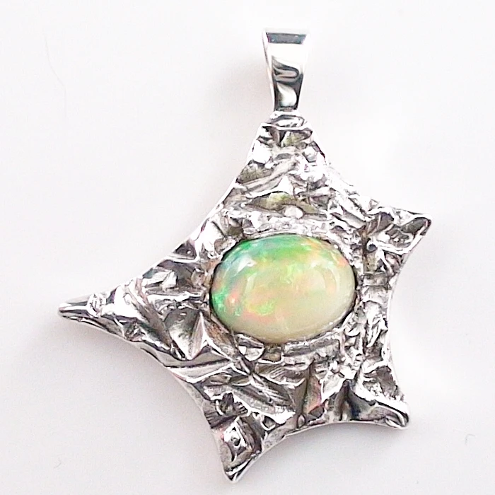 935 Silber Anhänger mit 1,34 ct. Welo Opal – Kunstvoller Designer-Anhänger mit Welo Opal aus Afrika Dieser kunstvolle handgefertigte 935 Silber-Anhänger präsentiert einen faszinierenden Welo Opal aus Afrika – der Wiege des Lebens. Das markante Sterndesign besticht durch seine strukturierte, organisch anmutende Oberfläche, die den edlen Opal wirkungsvoll umrahmt und ihm eine besondere Tiefe verleiht. Der Welo Opal begeistert mit seinem brillanten Multicolor-Farbenspiel, das auf dem transluzenten Körper des Steins in lebendigen Farbnuancen erstrahlt. Die ausdrucksstarke Textur der massiven 935er Silberfassung unterstreicht die natürliche Schönheit des Opals auf moderne und zugleich ursprüngliche Weise. Mit seiner harmonischen Größe und dem außergewöhnlichen Design ist dieser Anhänger ein echtes Statement-Piece für anspruchsvolle Schmuckliebhaber. Der Anhänger besitzt ein Gewicht von 5,23 Gramm und misst 23,36 mm in der Länge, 22,61 mm in der Breite und 5,46 mm in der Höhe. Die Gesamtlänge beträgt 28,08 mm. Die Öse mit 2,62 mm Durchmesser ermöglicht die Verwendung mit verschiedenen Kettenarten. Anhänger Details Material: massiv Silber 935 Gewicht: 5,23 Gramm Größe (L x B x H): 23,36 x 22,61 x 5,46 mm Gesamtlänge: 28,08 mm Öse Durchmesser: 2,…