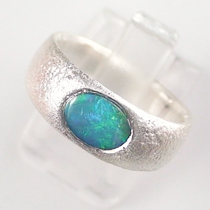935er Opal Ring mit 0,39 ct. Blau Türkis Grüner Crystal Opal – Opalschmuck ganz einfach und bequem online kaufen. Dieser Opal Ring aus massivem 935er Silber besticht durch seine breite, massive Ringschiene mit edler Ice Frosted Oberfläche, die dem Ring einen modernen und zugleich ausdrucksstarken Charakter verleiht. Der Crystal Opal ist sicher in die kräftige Schiene eingebettet und kommt durch den reizvollen Kontrast zur mattierten Oberfläche besonders schön zur Geltung. Gefertigt in Deutschland mit viel Liebe zum Detail, ist dieser Ring ein Zeugnis feiner Goldschmiedekunst. Der Crystal Opal aus dem australischen Coober Pedy begeistert mit einem brillanten Farbspiel in Blau-, Türkis- und Grüntönen, das dem Stein eine außergewöhnliche Strahlkraft gibt. Mit seinem Fancy Oval Schliff und 0,39 ct entfaltet der Opal seine volle Wirkung in der sorgfältig gearbeiteten Fassung. Wie jedes unserer Schmuckstücke wird auch dieser Ring mit einem Lichtbild-Zertifikat versandt, das seine Authentizität und Qualität belegt – ein einzigartiges Schmuckstück, das Natur und Handwerk perfekt verbindet. Ring Material: massiv Silber 935 Gewicht: 6,07 Gramm Ring Innendurchmesser: 17,50 mm Ring Innenumfang: 55,00 mm Ring Kopf (LxBxH): 7,52 x 7,72 x 2,49 mm Ringschienen Breite: 4,93 mm Ringschienen Dicke: 1,60 mm   Opal Opal Typ: C…