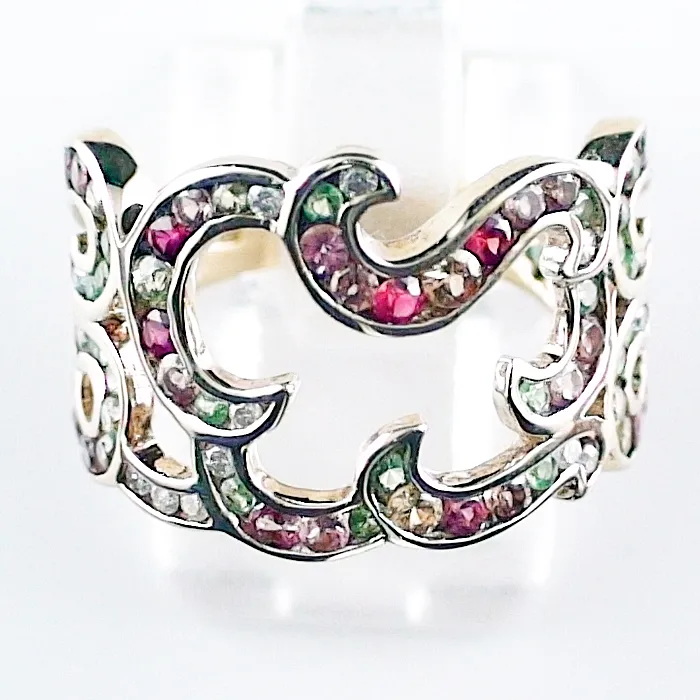 Besonders hervorzuheben ist die außergewöhnliche Besetzung mit verschiedenen natürlichen Edelsteinen, die dem Ring sein charakteristisches, buntes Erscheinungsbild verleihen. Die sorgfältig ausgewählten Steine umfassen f…