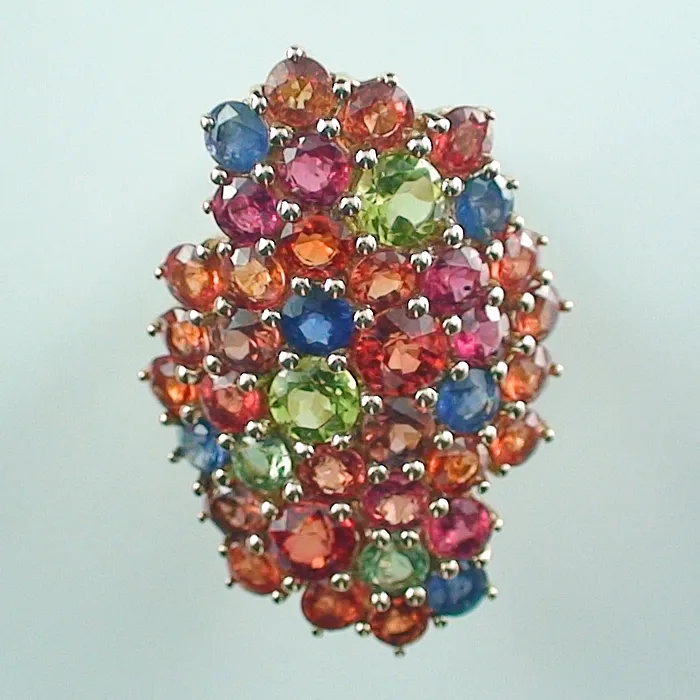 9k Gelbgold-Ring mit diversen Edelsteinen – Extravagantes Cluster-Design mit Rubinen, Saphiren, Peridot und Apatit