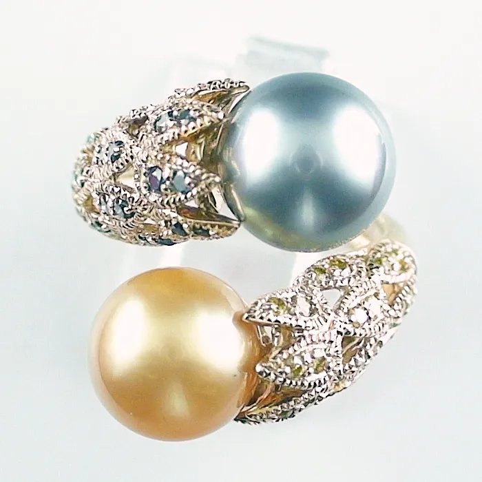 Dieser handgefertigte 9k Gelbgold-Ring vereint die natürliche Eleganz kostbarer Perlen mit dem funkelnden Glanz farbiger Diamanten zu einem außergewöhnlichen Schmuckstück. Das raffinierte Bypass-Design lässt zwei prächtige Perlen – eine goldene Südsee-Perle und eine silbergraue Tahiti-Perle – einander gegenüberstehen und erzeugt so eine faszinierende Symbiose von Farben und Formen. Die beiden mit Diamanten besetzten Ringschienen umfließen die Perlen in eleganten Bögen und schaffen ein dynamisches, skulpturales Erscheinungsbild. Die Kombination aus warmem Gelbgold, den kontrastierenden Perltönen und den leuchtenden blauen sowie gelben Diamanten verleiht diesem Ring einen einzigartigen und luxuriösen Charakter.