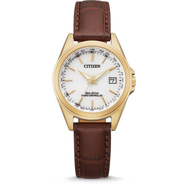 Präzise Zeitmessung rund um die Uhr: Die Damen Funkuhren von CITIZEN erfüllen nicht nur höchste Ansprüche an Genauigkeit und Zuverlässigkeit, sondern zeichnen sich auch durch erstklassiges Design aus. Citizen Solar Damen Funkuhren – Präzisions Manufaktur Funk-Solarwerk (Cal. H246 Eco-Drive Antrieb) – milchweisses Zifferblatt – aufgedruckte Minuterie (schwarz) – goldene Indexeinteilung mit Leuchtmasse – goldene Leuchtzeiger mit inaktiver Leuchtmasse – weisse Datumsanzeige- Stoss-Erkennungsfunktion – vergoldetes Edelstahlgehäuse – kratzfestes Saphirglas (flach) – geschützte Flanken  – verschraubter Edelstahlboden mit Eco Drive Logo – robustes Kalbslederarmband (braun) – Materialien erfahrungsgemäss antiallergisch Saphirglas: König unter den Uhrgläsern. Das hochwertigste Glas für Uhren. Die Härte (2100 Vickers) und Kratzfestigkeit wird lediglich vom Diamanten übertroffen  Umweltfreundliche Solartechnologie: 180 Tage Gangreserve, 3 Jahre Dunkelgangreserve, Ladekontrollanzeige (kein Batteriewechsel mehr nötig) Funkuhr: Automatische Zeiteinstellung, automatische Umstellung auf Sommer- und Winterzeit, Zeitzonen-Einstellung möglich. Der Sender der Cäsium-Atomzeitbasis mit der genauesten Uhr der Welt (Abweisung 1 Sekunde in ca. 2’000’000 Jahren) befindet sich bei Frankfurt a.M. Dessen Funksignale können in einem Radius von ca. 1'500 km empfangen werden. 10 ATM wasserdicht (nach DIN) bedingt zum Schwimmen geeignet Ø: 29 mm, h: 8.5 mm, ca. 32g 2 Jahre Garantie  Preis inkl. original Box, Zertifikat, Gebrauchsanweisung, Verzeichnis der Servicestellen und Produkteinformation Stilvolle Eleganz und technische Präzision: Die Citizen EC1180-14A. Die edle Damenuhr bietet eine moderne Optik mit stilvollen goldfarbenen Akzenten. Das Gliederarmband mit aktueller Bicolor-Optik und praktischer Faltschliesse besteht aus hochwertigem Edelstahl. Das edle Gehäuse mit einem Durchmesser von ca. 29 mm und einer Höhe von ca. 8 mm zeigt ein Uhrglas aus entspiegeltem Saphirglas für perfekte Ablesbarkeit. Das Zifferblatt mit analoger Zifferblattanzeige ist in Weiss gehalten, während die Strichindizes in Schwarz und Gold den eleganten Bicolor-Look komplettieren. Funkuhr mit umweltfreundlichem Antrieb. Durch eine moderne Funktechnologie wird Ihnen immer die präzise Zeit angezeigt, die manuelle Zeiteinstellung entfällt. Das nachhaltige Eco-Drive-Quarzwerk verfügt über einen innovativen Antrieb: Bei Sonnen- oder Kunstlichteinstrahlung erzeugt die Uhr durch eine Solarzelle Energie, wodurch Ihre Armbanduhr bis zu 180 Tage voll funktionsfähig bleibt. Die Dunkelgangreserve erhöht die Laufzeit auf 2,5 Jahre. Geniessen Sie die besondere Kombination aus edlem Design und zukunkftsweisender Technik. Original Citizen Uhr vom Schweizer Uhrmacher Neue Damenuhr mit Garantie des Herstellers. Die Uhr kann gerne vor einer Kaufentscheidung besichtigt, und auch vor Ort in Basel abgeholt werden. Portofreie Lieferung ⭐ Weitere » Damenuhren finden Sie auch in unserem Fachgeschäft in Basel. ⌚ OFFIZIELLE VERTRETUNG Wir verkaufen seit über 50 Jahren Uhren und sind ein zertifizierter Trusted Shop Als autorisierter Schweizer Fachhändler der Marke CITIZEN profitieren Sie auch online von den entscheidenden Vorteilen hinsichtlich der Echtheit, den Garantieleistungen und des Nachverkaufsservice beim Online-Kauf. So wie Sie es vom Uhrmacher Ihres Vertrauens gewohnt sind. Wir führen in unserem Uhren Fachgeschäft in Basel noch weitere Armbanduhren an Lager. Wenn Sie eine persönliche Kaufberatung wünschen, stehen wir ihnen unter 061 263 92 08 gerne zur Verfügung. Auch finden Sie in unserem Onlineshop UHREN-SHOP.ch mehr Citizen Modelle. Einfach auf das Logo klicken »