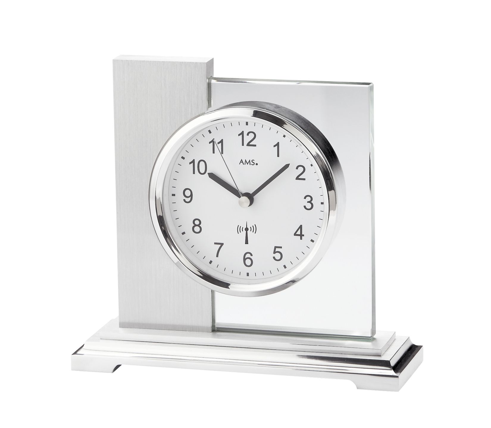 Stilvolle Funk-Tischuhr im Metallgehäuse, mit geschliffenem Mineralglas und Aluminium-Frontreif.