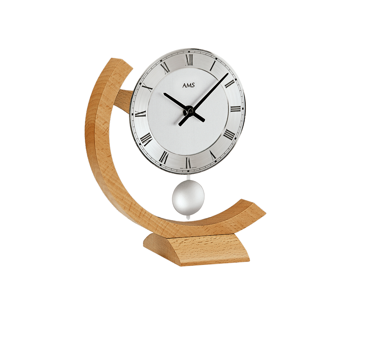 Design Quarz-Pendeltischuhr mit Buche-Massivholzgehäuse und Metallzifferblatt. Maße: 18 x 22 x 4cm.