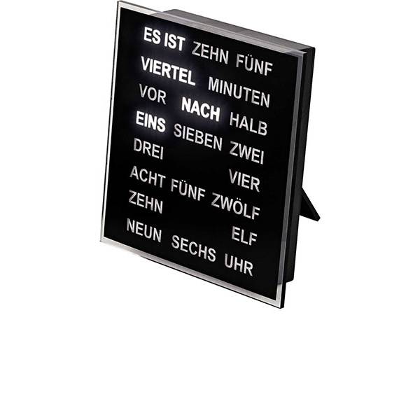 Die Wörter der Uhrzeit werden auf dem schwarzen LED Zifferblatt weiss erleuchtet. Das macht sie zu einem Hingucker in jeder Wohnung. Die Tisch- oder Wanduhr wird nicht mit einer Batterie sondern durch ein Netzteil angetrieben. WORDCLOCK – Wortuhr zum Hinstellen oder Aufhängen – geräuschloser Quartz Uhrwerk- schwarzes Display – weisse LED Zeitanzeige (in Worten)- schwarzes Duroplast-Kunststoffgehäuse- schwarzes Netzkabel (ca 1.5M) Staubgeschützt Nur für den Innengebrauch!b: 20 cm, h: 20cm, t: 4 cm2 Jahre GarantiePreis inkl. Kartonbox, Gebrauchsanweisung, Kabel, 12 Volt Netzteil, VRG Original Uhren mit Garantie vom Schweizer Uhrmacher Die Tischuhr aus schwarzem Kunststoff lässt sich wie ein Fotorahmen aufstellen und wird inklusive Netzteil geliefert. Sie kann gerne vor einer Kaufentscheidung besichtigt, und auch vor Ort in Basel abgeholt werden. Portofreier Versand! #Tischuhr ohne Zeiger und Zahlen