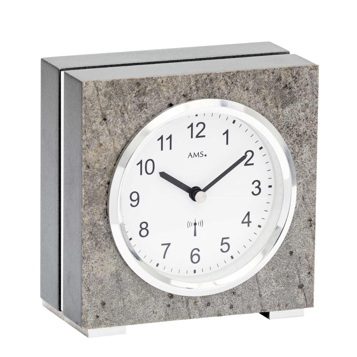 • Funkwerk <br />• Holzgehäuse. Aluminium. Stein-Auflage<br />• Bedrucktes Zifferblatt<br />• Mineralglas und Aluminium Frontring<br />• <br />• Gewicht: 0,5kg<br />• Maße: 13 x 12 x 6 cm<br />• Benötigte Batterien: LR6Alkaline<br />• EAN: 4037445156418