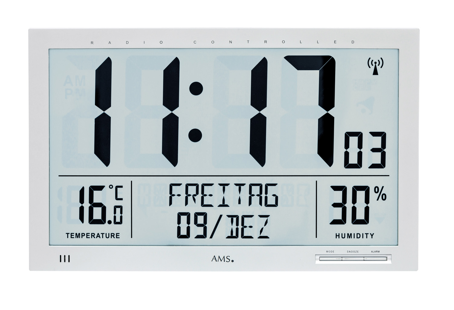 • Funkwerk mit digitaler Anzeige von Zeit, Datum, Wochentag, Temperatur, Feuchtigkeit