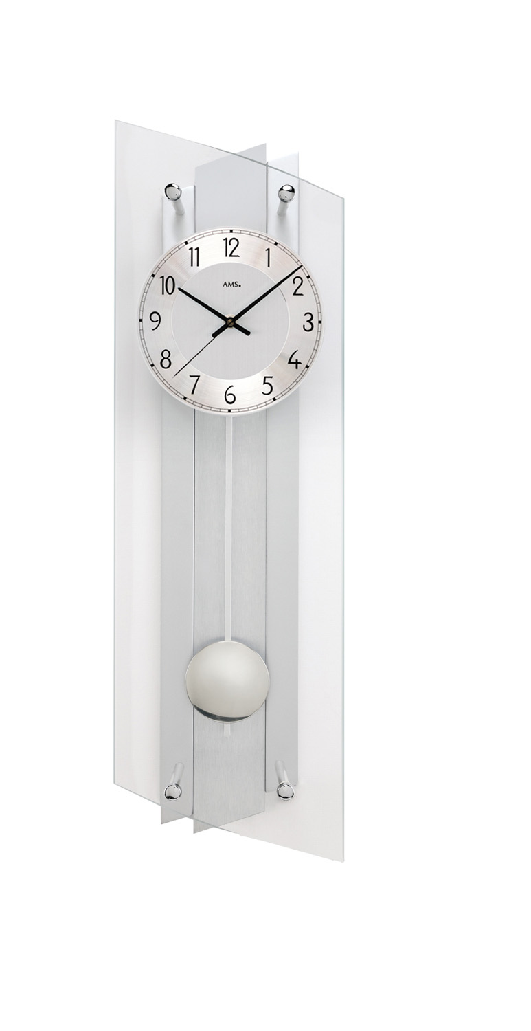 • Quarz-Pendelwerk<br />• Silberlackierte Holzrückwand<br />• Aluminium-Zifferblatt<br />• Geschwungenes Mineralglas<br />• Aluminium-Applikationen<br />• Gewicht: 1,7kg<br />• Maße: 67 x 19 x 10 cm<br />• Benötigte Batterien: 2xLR6Alkaline<br />• EAN: 4037445155565