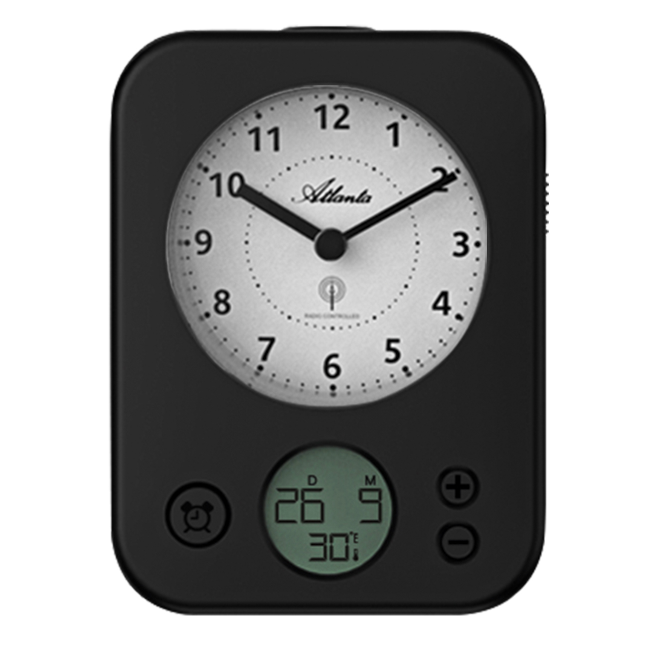 Funkwecker analog mit digitaler Anzeige der Uhrzeit oder wahlweise von Datum und Temperatur