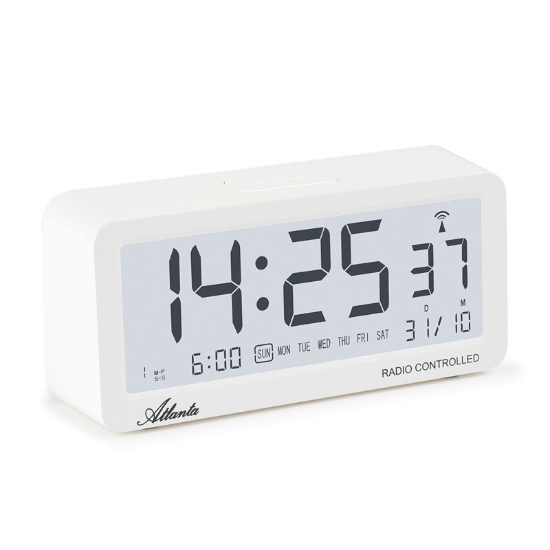 Digitaler Funkwecker mit 3 Weckzeiten, Alarm von Mo – Fr + Sa – So getrennt einstellbar, wählbarer 12/24 Stunden Anzeige, Zeitzonenverstellung, Repetition, Licht, Crescendo, moderner Optik