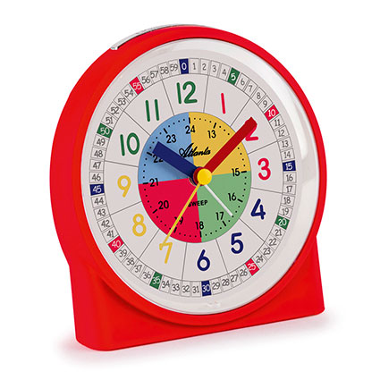 Kinderwecker mit farbigem Lernzifferblatt, schleichender Sekunde, seitlichem Alarmschalter, Crescendo/ansteigendem Wecksignal