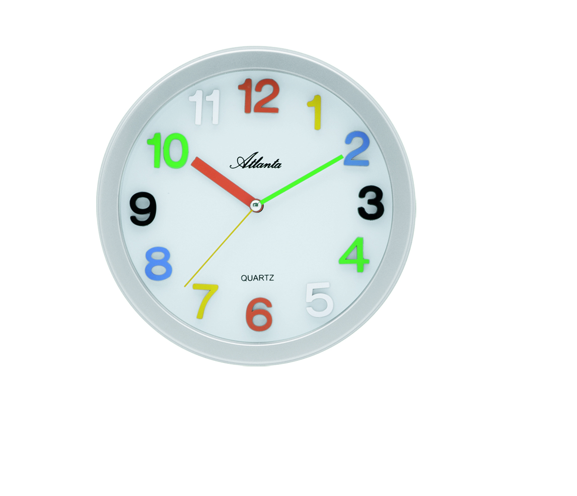 Quarz-Wanduhr mit schleichender Sekunde und bunt-fröhlichen arabischen Ziffern.