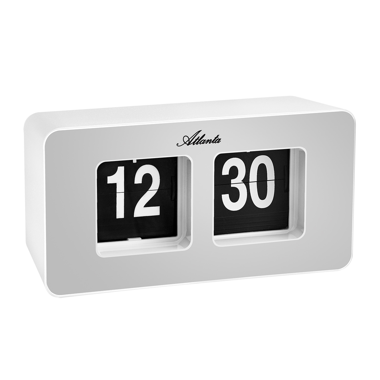 Quarz-Tischuhr, Retro-Design mit Flip-Anzeige, weißes Kunststoffgehäuse.