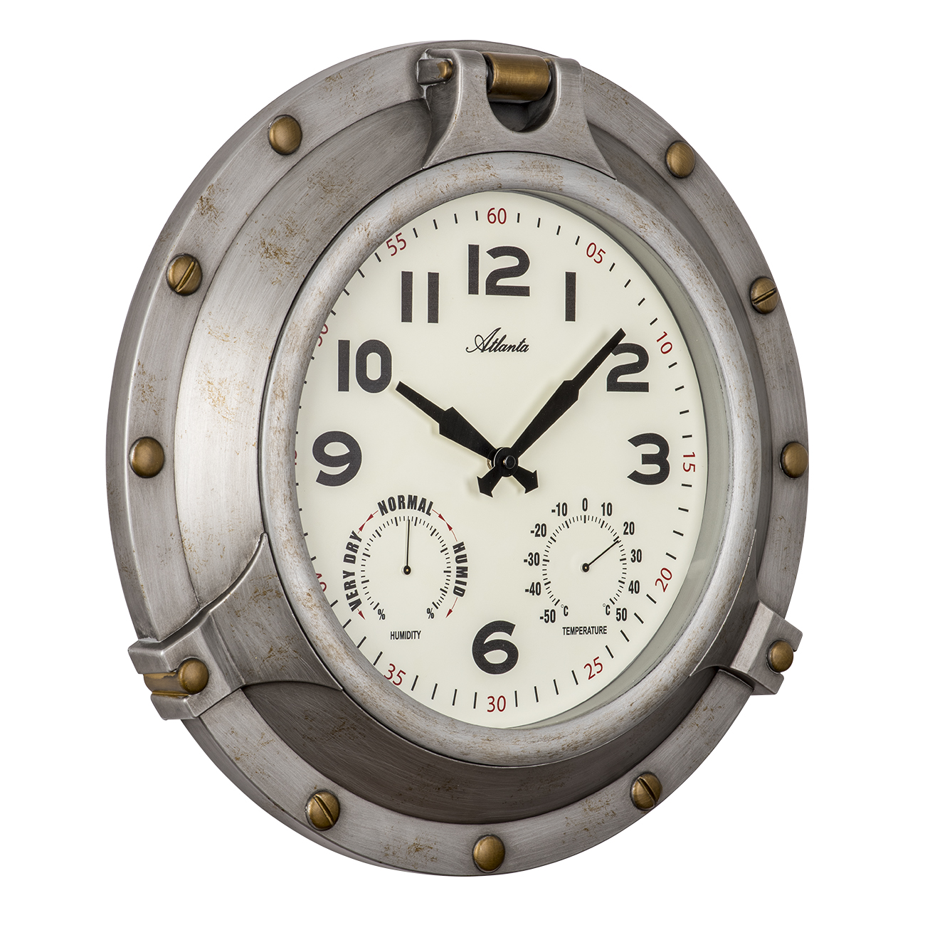 Wanduhr Quarz "Bullauge", Mineralglas, auch für den Außenbereich geeignet, zusätzliche Anzeige von Temperatur und Luftfeuchtigkeit