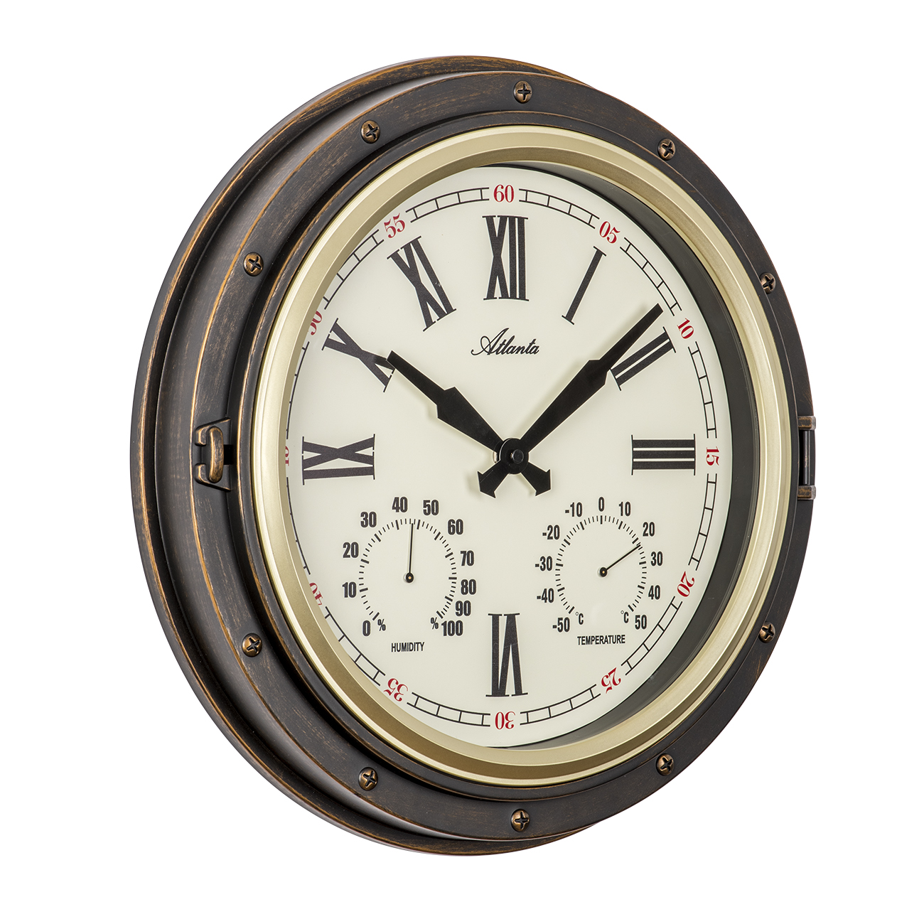 Wanduhr Quarz, Mineralglas, auch für den Außenbereich geeignet, zusätzliche Anzeige von Temperatur und Luftfeuchtigkeit