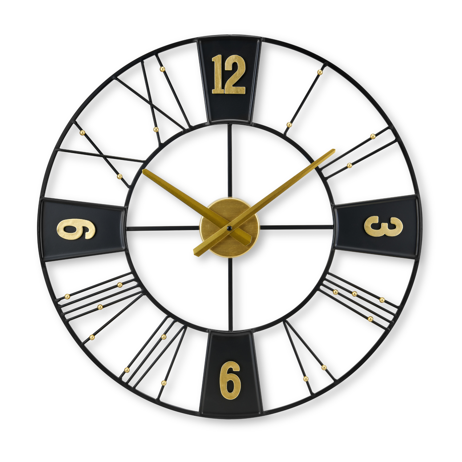 Industrial-Style Quarz-Wanduhr, aufgesetzte, gebürstete, arabische Ziffern auf schwarzem Untergrund und zu jeder Viertelstunde sowie mit aufgesetzen mattgoldfarbenen Metallkugeln verzierte, ins Metallgehäuse integrierte römische Ziffern, goldfarbenes Zentrum mit goldfarbenen Zeigern.