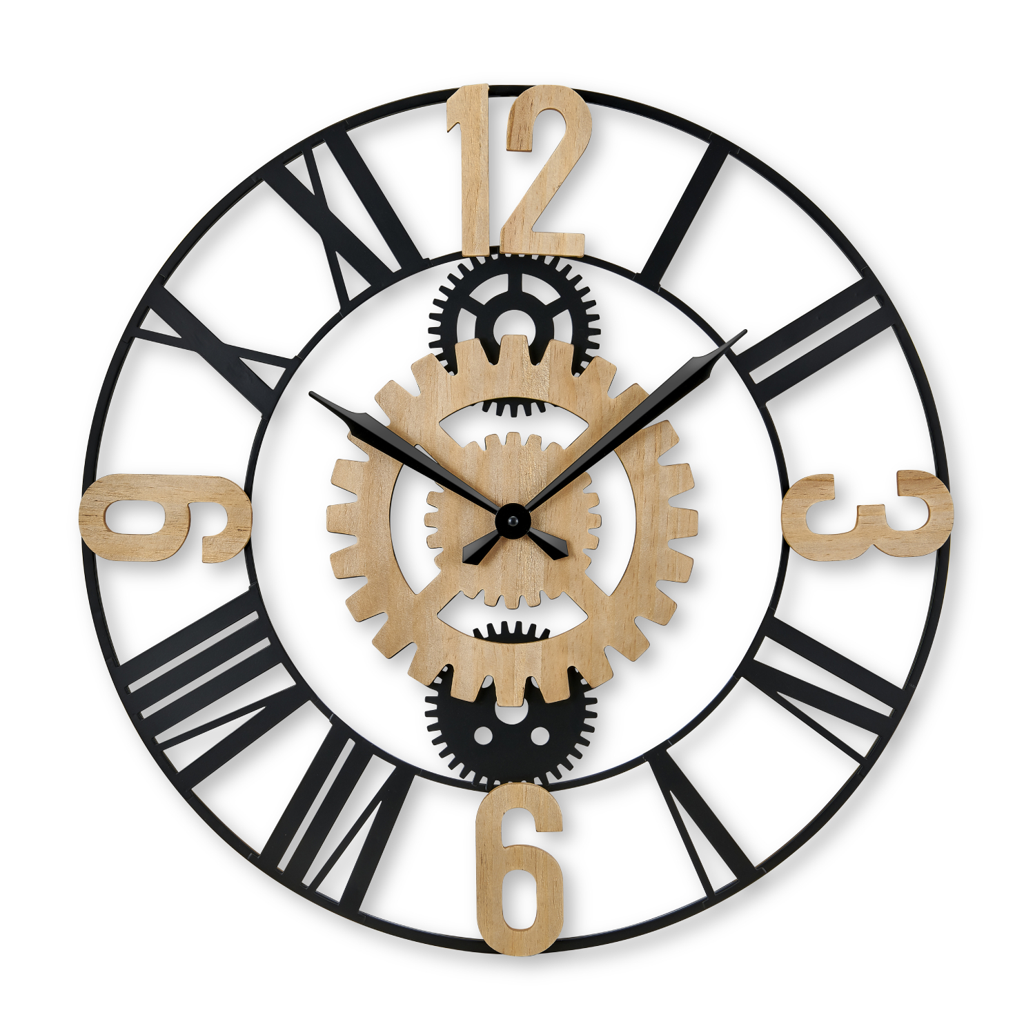 Industrial-Style Quarz-Wanduhr mit großen arabischen und römischen Ziffern und aufgesetzten Zahlen- und Zahnradelementen.