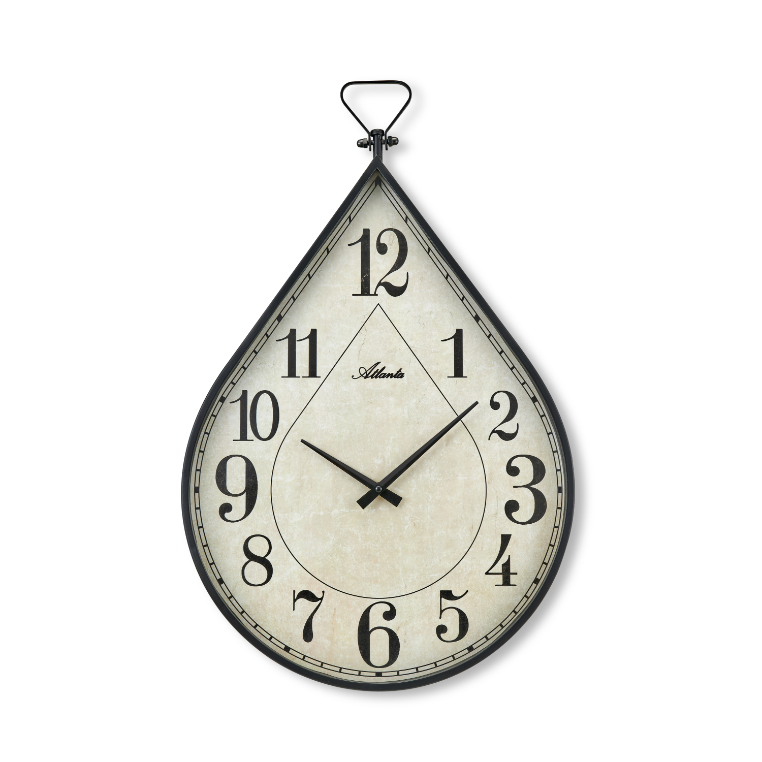 Retro-Style Quarz-Wanduhr, wertiges Metallgehäuse in Tropfenform, Zifferblatt in antiker Optik, arabische Ziffern.
