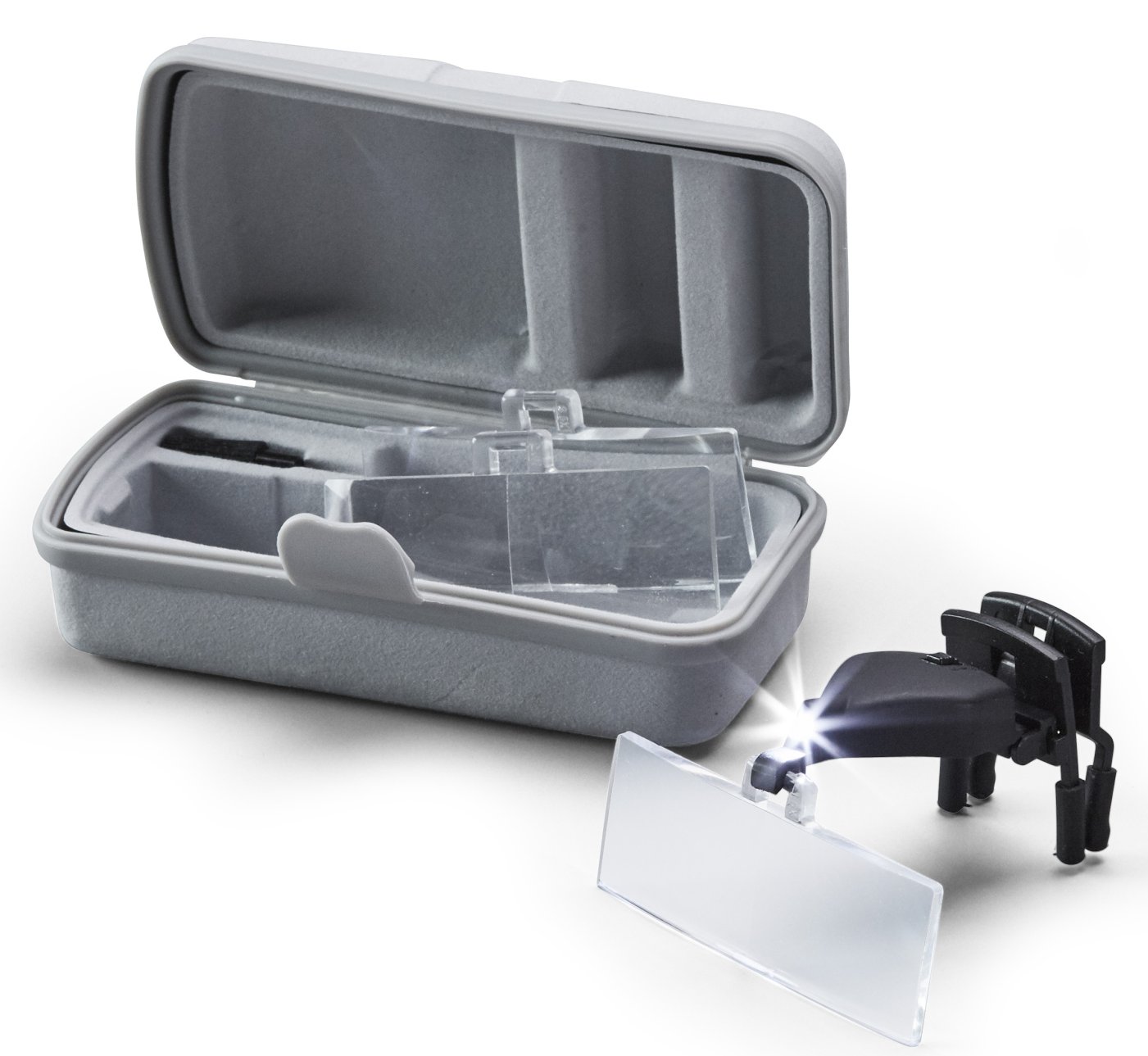<br />Aufsetzlupen mit LED-Beleuchtung, auswechselbar in 1,5-, 2,5- und 3,5-facher Vergrößerung.