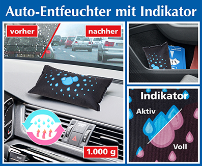 <br /><br />Daher erhalten Sie bei uns den äußerst praktischen Auto-Enfeuchter mit INDIKATOR! Sobald das Entfeuchter-Kissen mit Feuchtigkeit vollgesogen ist, wird dies über den integrierten Farbindikator durch einen Wechsel von Blau zu Rosa angezeigt. Anschließend kann der Entfeuchter einfach auf der Heizung oder in der Mikrowelle getrocknet und danach wiederverwendet werden. Tropft nicht!