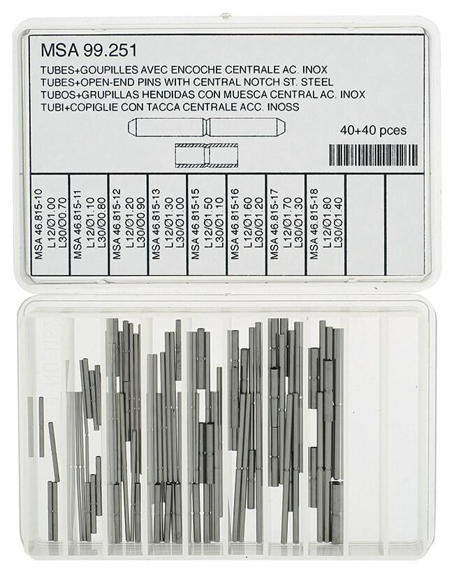 Bandhülsen und Stifte Sortiment Edelstahl Länge Hülse 12,00mm, Stift 30,00mm, Ø Hülse 1,00-1,80mm, Stift 0,70-1,40mm, Inhalt 80 Stk.