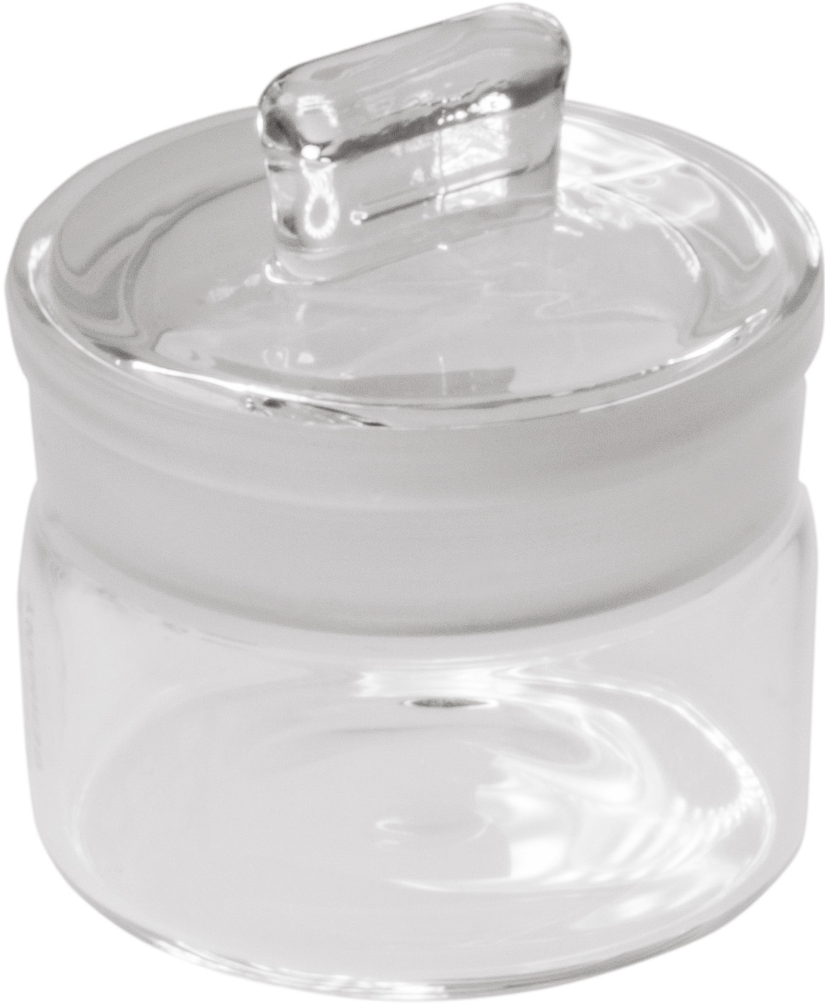 Glasbehälter mit eingeschliffenem Deckel und Knauf aus Glas.