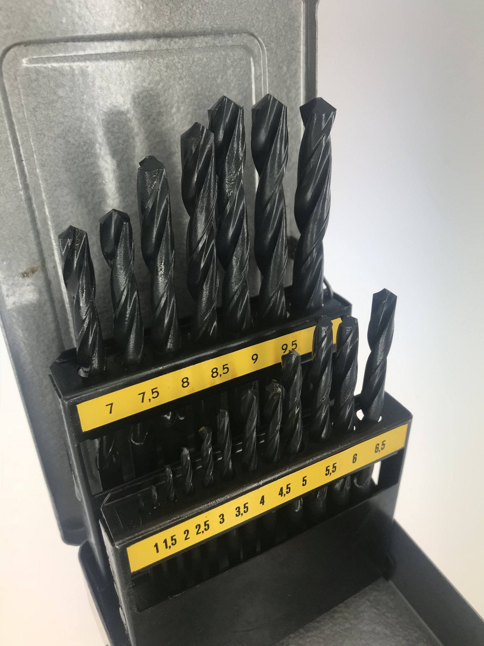 <br />je 1 HSS-Spiralbohrer in den Größen 1,0 – 1,5 – 2,0 – 2,5 – 3,0 – 3,5 – 4,0 – 4,5 – 5,0 – 5,5 – 6,0 – 6,5 – 7,0 – 7,5 – 8,0 – 8,5 – 9,0 – 9,5 und 10,0.