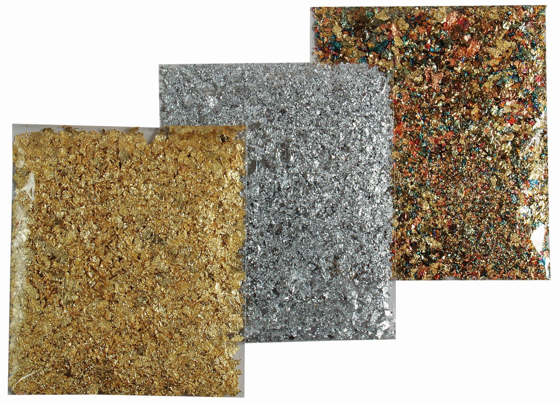 "Alltägliche Gegenstände, mit Blattmetall veredelt, werden zu raffinierten Einzelstücken mit besonderem Glanz. Geeignet auf Holz, Glas, Papier, Leinwand, Kartonage, Styropor, Kunststoff, Wachs, Keramik, Porzellan, Terrakotta, Folie, Metall, Stein, Leder und durchgetrockneter Beton. Fein geflockt, mit detaillierter Anleitung.