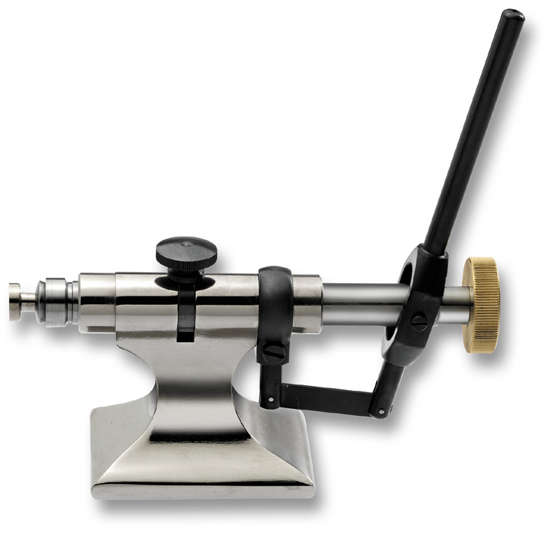 Mit Pinole Ø 8 mm für Spannzangen. Mit schwenkbarem Bohrhebel und Klemmring zum Feststellen der Bohrpinole für Anschlagarbeiten von der Spindelseite aus, mit Einsatz und Bohrplatte. Pinolenweg: 25 mm.
