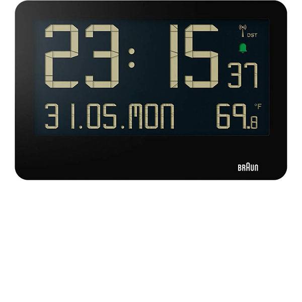 Schwarze Digital-Funk Wanduhren von BRAUN® – Funkgesteuerte Zeitanzeige- geräuschloses, CE zertifiziertes Uhrwerk- digitale Zeitanzeige- kontrasstarkes Zifferblatt (schwarz)- Wahlweise 12 oder 24-Std. Modus – Datums- und Temperaturanzeige- schwarzes Duroplast Kunststoff-Gehäuse (poliert)- integrierte Halterungen für Wand oder Tisch Funkuhr:Automatische Zeiteinstellung, automatische Umstellung auf Sommer- und Winterzeit, keine Zeitzonen-Einstellung möglich! Der DCF-Sender der Cäsium-Atomzeitbasis mit der genauesten Uhr der Welt (Abweisung 1 Sekunde in ca 2’000’000 Jahren) befindet sich bei Frankfurt a.M. Dessen Funksignale können in einem Radius von ca. 1’500 km empfangen werden.Einfache Montage zum Hängen oder StellenKein Versand ausserhalb der Schweiz! Nur für den Innengebrauch! B: 26.1cm H: 17.3cm, t: ca 2.5 cm, ca. 660g2 Jahre Garantie Preis inkl. original Kartonbox, 2 Batterien (LR6/AA, 1.5V),  Gebrauchsanweisung, VRG Die Batterien werden von BRAUN bereits mitgeliefert. Es ist aber auch möglich Akkus (aufladbare Batterien) zu verwenden und dadurch die Umwelt zu schonen. Kontrolle der Raumtemperatur Das Wohlbefinden am Büroarbeitsplatz hängt von vielen Faktoren ab, unter anderem auch vom Raumklima. Deshalb ist es wichtig, in allen Räumen für eine möglichst optimale Feuchtigkeit und Temperatur zu sorgen Die optimale Raumtemperatur in Wohnräume ist normalerweise ca. 20° C. Braun Digitaluhren In den letzten sechs Jahrzehnten ist Design zu einer zentralen Säule der Marke Braun geworden. Die Werte Qualität, Funktionalität, Klarheit, Langlebigkeit und Zeitlosigkeit wurden in eine nachhaltige Designphilosophie integriert. Es gibt wenige bessere Beispiele für diese dauerhafte Design-Prinzipien als Braun Uhren. Diese Armbanduhren, Wanduhren und Wecker wurden als Sammlungen von ansprechender Einfachheit geschaffen, wo weniger so viel mehr sein wird. Braun BC14 Original Uhren vom Schweizer Uhrmacher. Neue Uhren mit internationaler Garantie des Herstellers. Wir sind offizielle BRAUN Konzessionäre und bieten Ihnen alle Uhren portofrei mit 14 Tage Rückgaberecht an. Dieser Artikel kann gerne vor einer Kaufentscheidung besichtigt, und auch vor Ort in Basel abgeholt werden. Natürlich ist auch eine Vorort Besichtigung mit Beratung in unserem Fachgeschäft möglich. Reservation dringend empfohlen! Portofreie Lieferung. Gerne stehen wir Ihnen bei Fragen zur Verfügung. ⌚ OFFIZIELLE VERTRETUNG Wir verkaufen seit über 50 Jahren Uhren und sind ein zertifizierter Schweizer Trusted Shop. Als autorisierter Schweizer Fachhändler der Marke BRAUN profitieren Sie auch online von den entscheidenden Vorteilen hinsichtlich der Echtheit, den Garantieleistungen und des Nachverkaufsservice beim Online-Kauf. Braun ist ein eingetragenes Warenzeichen der Braun GmbH, Kronberg, Deutschland, verwendet unter Lizenz von Zeon Ltd. London, England. Beim Schweizer UHREN-shop finden Sie noch mehr Braun Uhren. Einfach auf das Logo klicken »