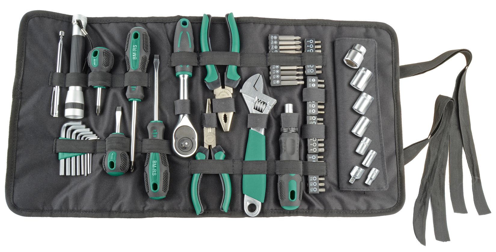 <br /><br />65-tlg. Werkzeug-Rolltasche. Elastische Schlaufen halten die Werkzeuge am vorgegebenen Platz.