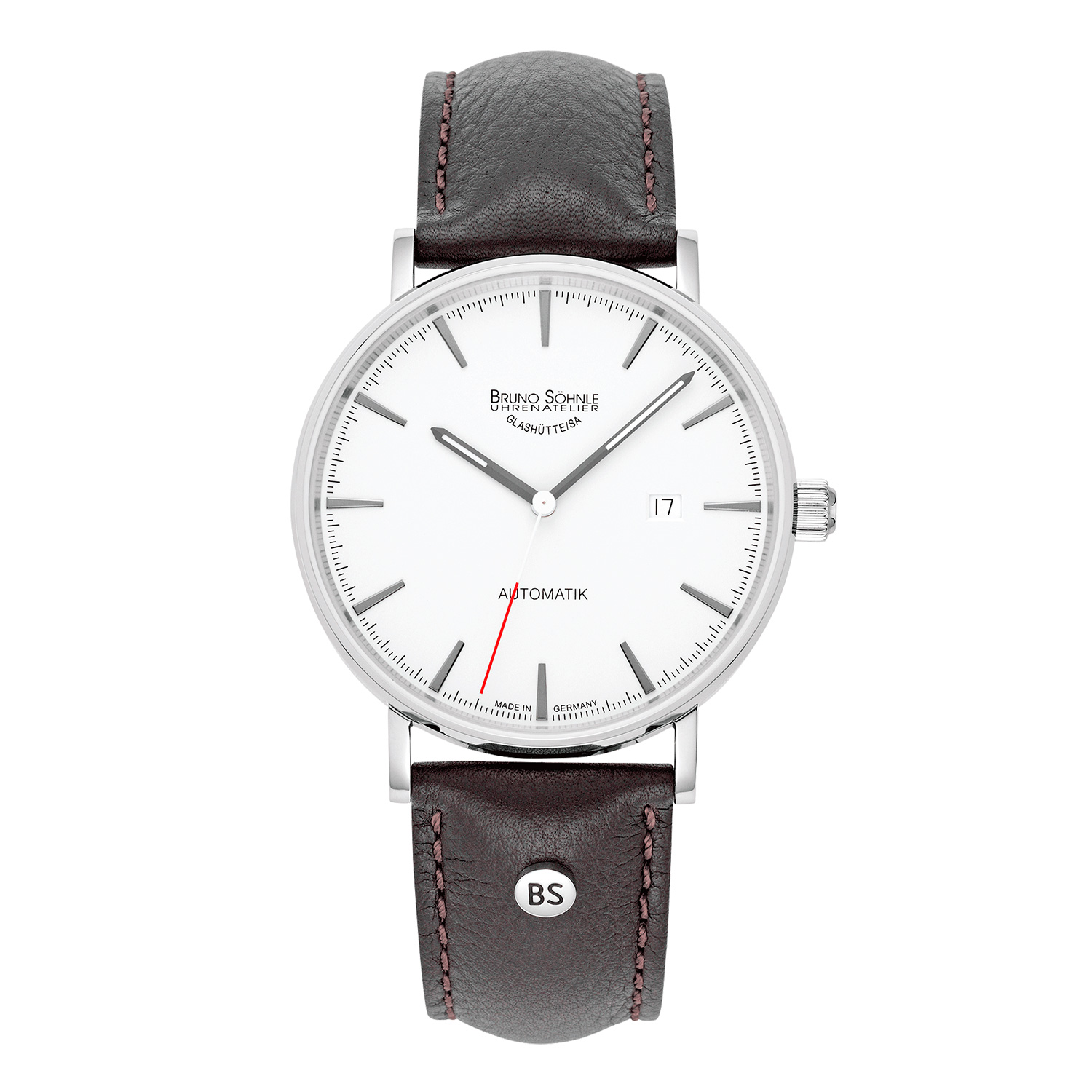 ÄSTHETIK UND FUNKTIONALITÄT – diese Bruno Söhnle-typische Symbiose verdeutlicht auch die MÜNCHEN AUTOMATIK I, die sich durch eine klare Formgebung und eine technisch überzeugende Präzision auszeichnet: Während das mit Indexen, Datumsanzeige bei der ‚3' und zentraler Sekunde versehene Zifferblatt ein mondänes Designbewusstsein ausstrahlt – und mit dem robusten Edelstahlgehäuse eine ebenso optisch ideale Einheit bildet –, sorgt im Innern das Automatikwerk für die stete Ganggenauigkeit.