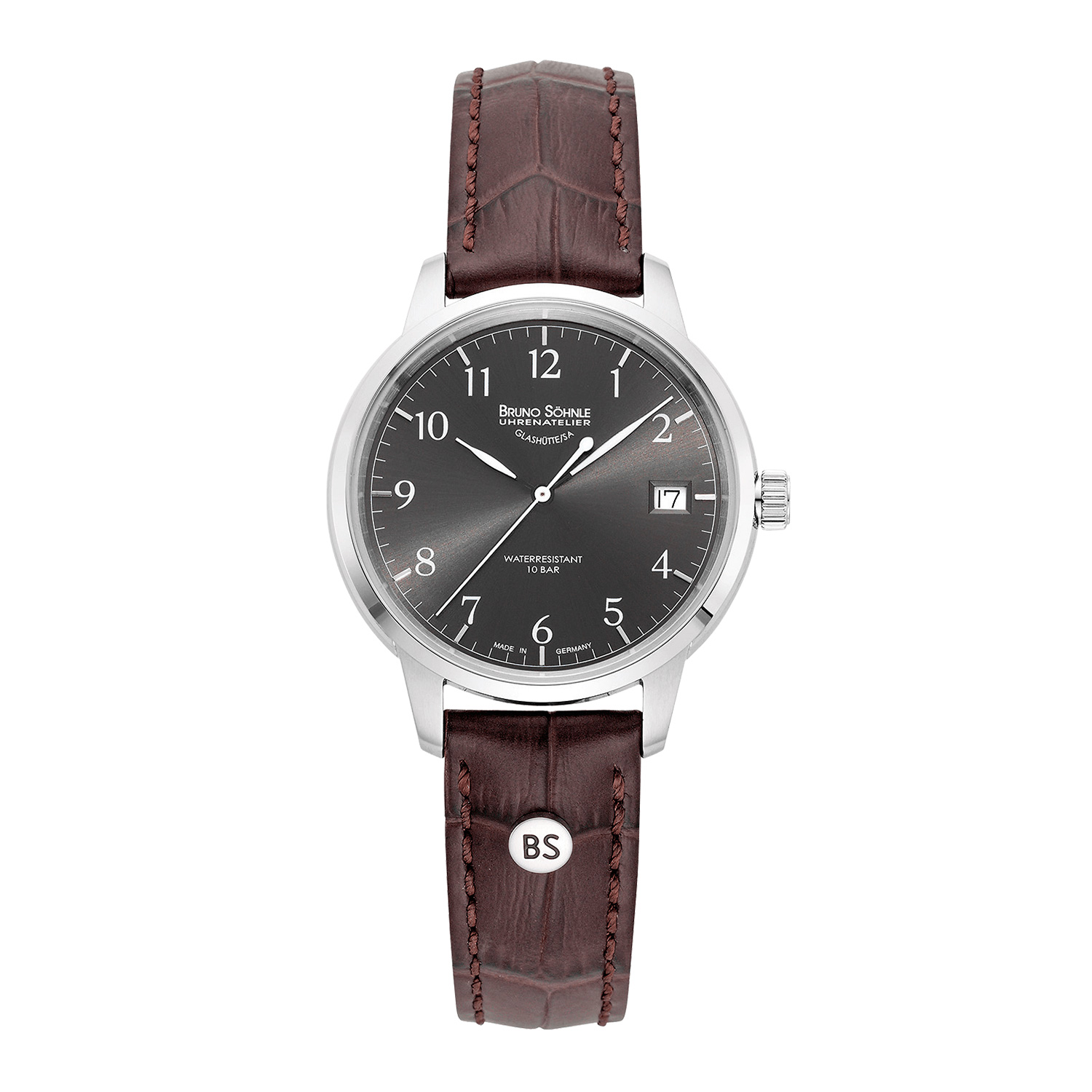 KLASSICH-SCHICK, BETONT WEIBLICH – diese Bruno Söhnle-typische Symbiose verdeutlicht auch die HAMBURG I SMALL, die sich durch eine klare Formgebung und eine technisch überzeugende Präzision auszeichnet: Während das geradlinige, mit arabischen Zahlen und kleinem Datum auf der ‚3‘ versehene Zifferblatt eine besondere Eleganz ausstrahlt – und mit dem robusten Edelstahlgehäuse eine ebenso optisch ideale Einheit bildet –, sorgt im Innern das Quarzwerk für die stete Ganggenauigkeit.