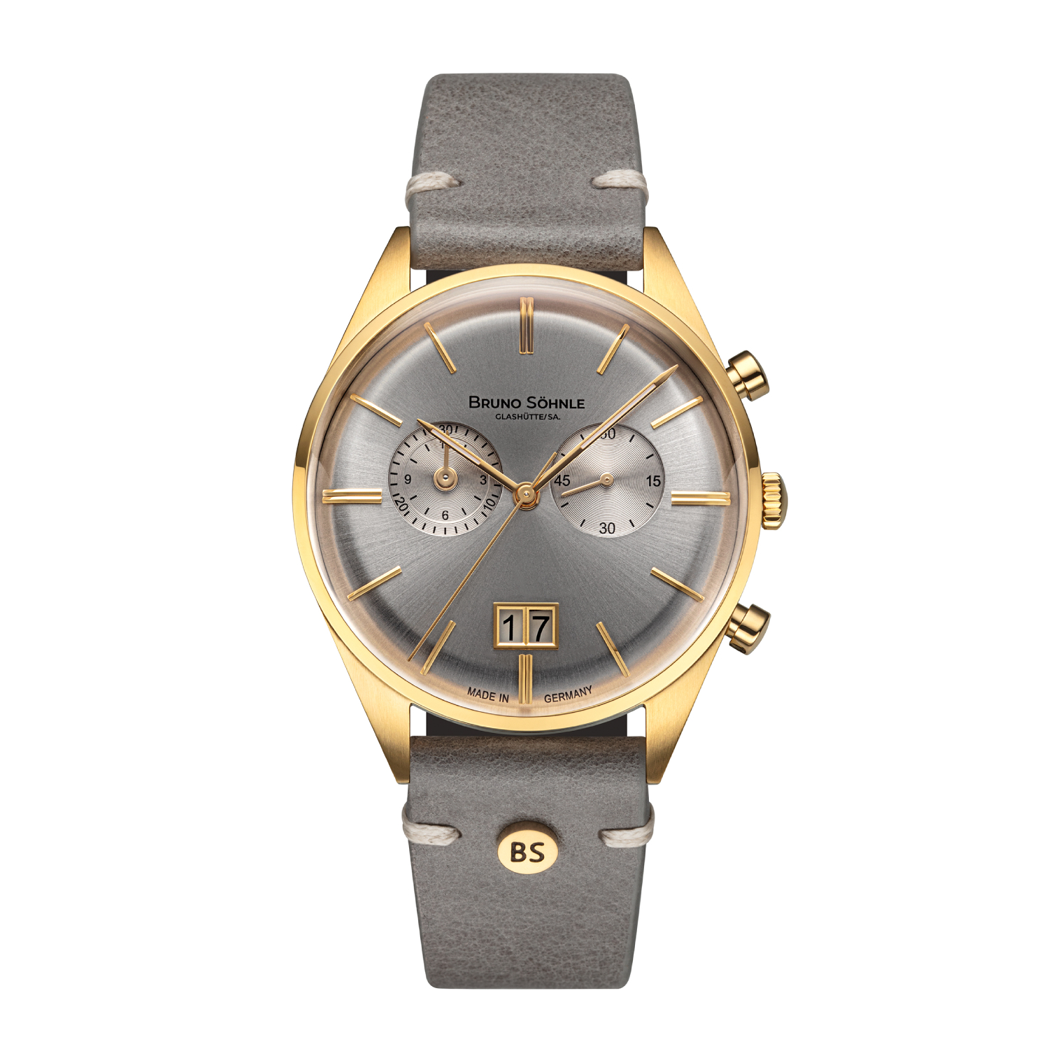 Der Merano Chronograph strahlt zeitlose Eleganz und funktionale Präzision aus. Das silberfarbene Zifferblatt, gewölbt und mit Sonnenschliff veredelt, zeigt zwei Hilfszifferblätter: Bei 3 Uhr befindet sich die kleine Sekunde, während der zentrale Sekundenzeiger für die Stoppsekunde reserviert ist. Der Totalisator bei 9 Uhr zeigt die gestoppten Minuten und Stunden an, jeweils mit separaten Zeigern. Das markante Großdatum bei 6 Uhr, das aus zwei separat schaltenden Datumsscheiben besteht, erinnert an die berühmte 5-Minuten-Uhr der Dresdner Semperoper. Das 40 mm Edelstahlgehäuse, veredelt durch eine IP-Gold-Beschichtung, wird durch ein stilvolles Steingrau-Lederarmband ergänzt. Im Inneren arbeitet das zuverlässige Schweizer Kaliber Ronda 5020.B, das in der Manufaktur durch Demontage, Veredelung mit Glashütter Streifenschliff und thermisch gebläuten Schrauben sowie anschließender Remontage perfektioniert wird.