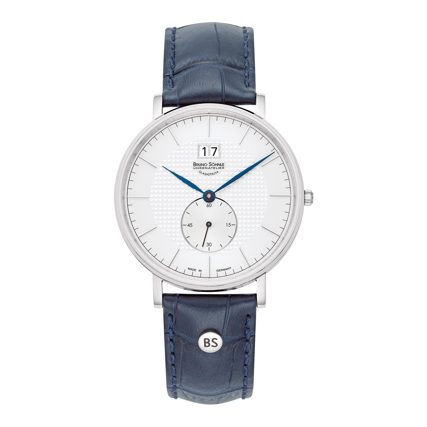 CHARAKTERISTISCHE FEINHEITEN – ein dunkelblaues Kalbslederarmband (mit Krokoprägung und Faltschließe) sowie das innen entspiegelte, das Zifferblatt gut schützende Saphirglas runden das außergewöhnliche Design der MÜNCHEN I maßgeblich ab: Gerade diese fein ausgearbeiteten Nuancen definieren eine Herren-Armbanduhr von Bruno Söhnle als einen vielseitigen wie beliebten Zeitmesser, der jedes Outfit gekonnt stilbewusst ergänzt.