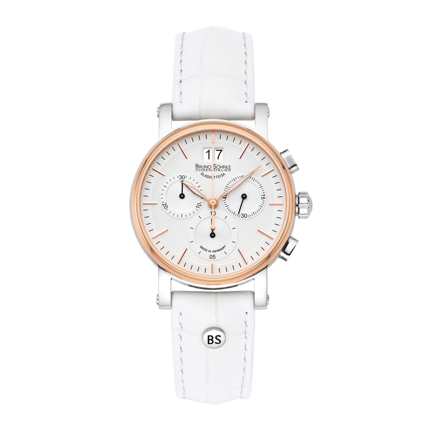 KLASSICH-SCHICK, BETONT WEIBLICH – diese Bruno Söhnle-typische Symbiose verdeutlicht auch der Chronograph PESARO SMALL, der sich durch eine klare Formgebung und eine technisch überzeugende Präzision auszeichnet: Während das mit Indexen und Großdatum bei ‚12‘ versehene Zifferblatt ein modernes Designbewusstsein ausstrahlt – und mit dem robusten Bicolor-Edelstahlgehäuse (IP rosé) eine ebenso optisch ideale Einheit bildet –, sorgt im Innern das Quarzwerk für die stete Ganggenauigkeit.