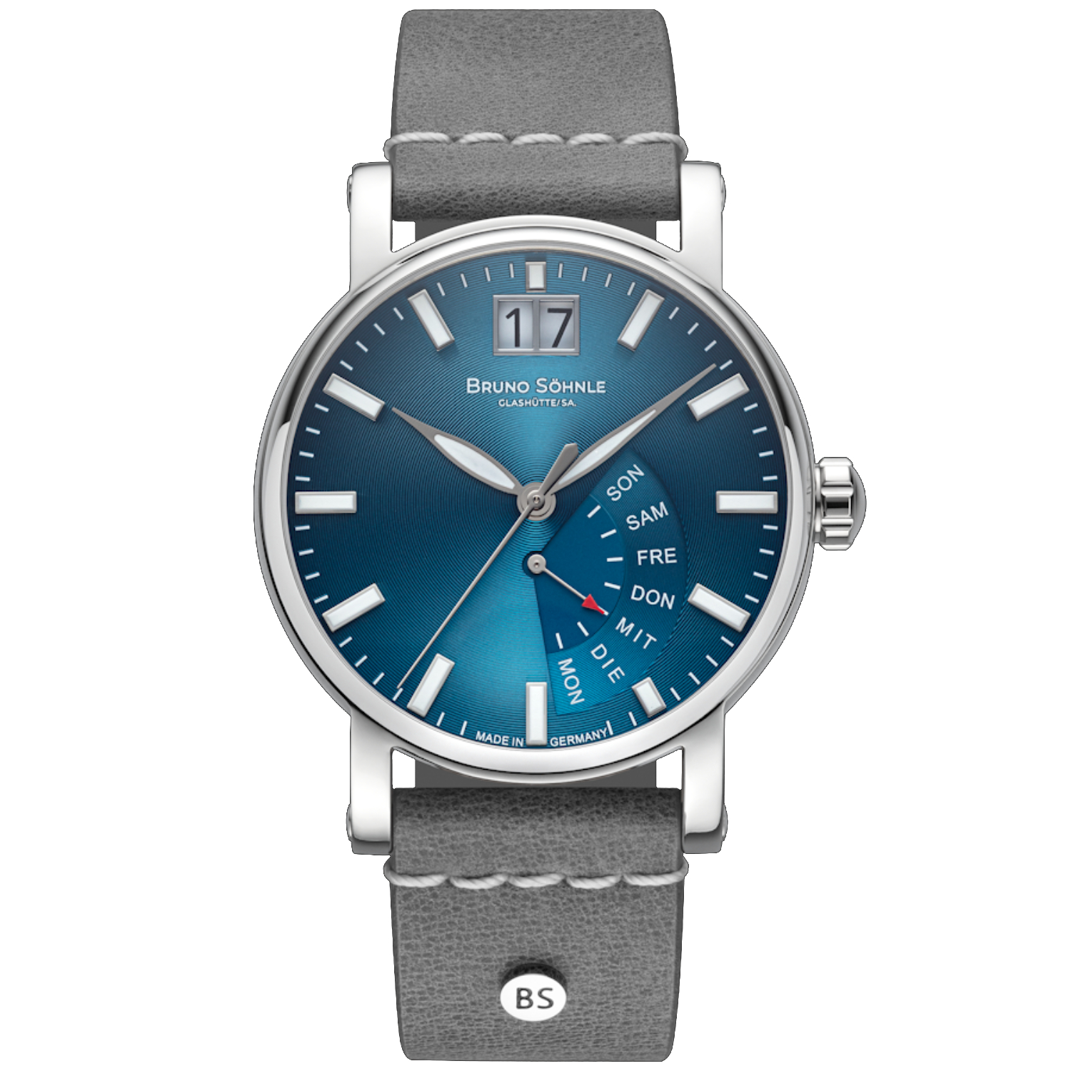 Mit ihrem tiefen Ozeanblau strahlt die Pesaro I (2025) eine subtile maritime Eleganz aus. Großdatum und Wochentaganzeige sorgen für harmonische Funktionalität, während das Vintage-Lederband dem Design eine warme, natürliche Note verleiht – eine Uhr, die Stil und Komfort vereint.