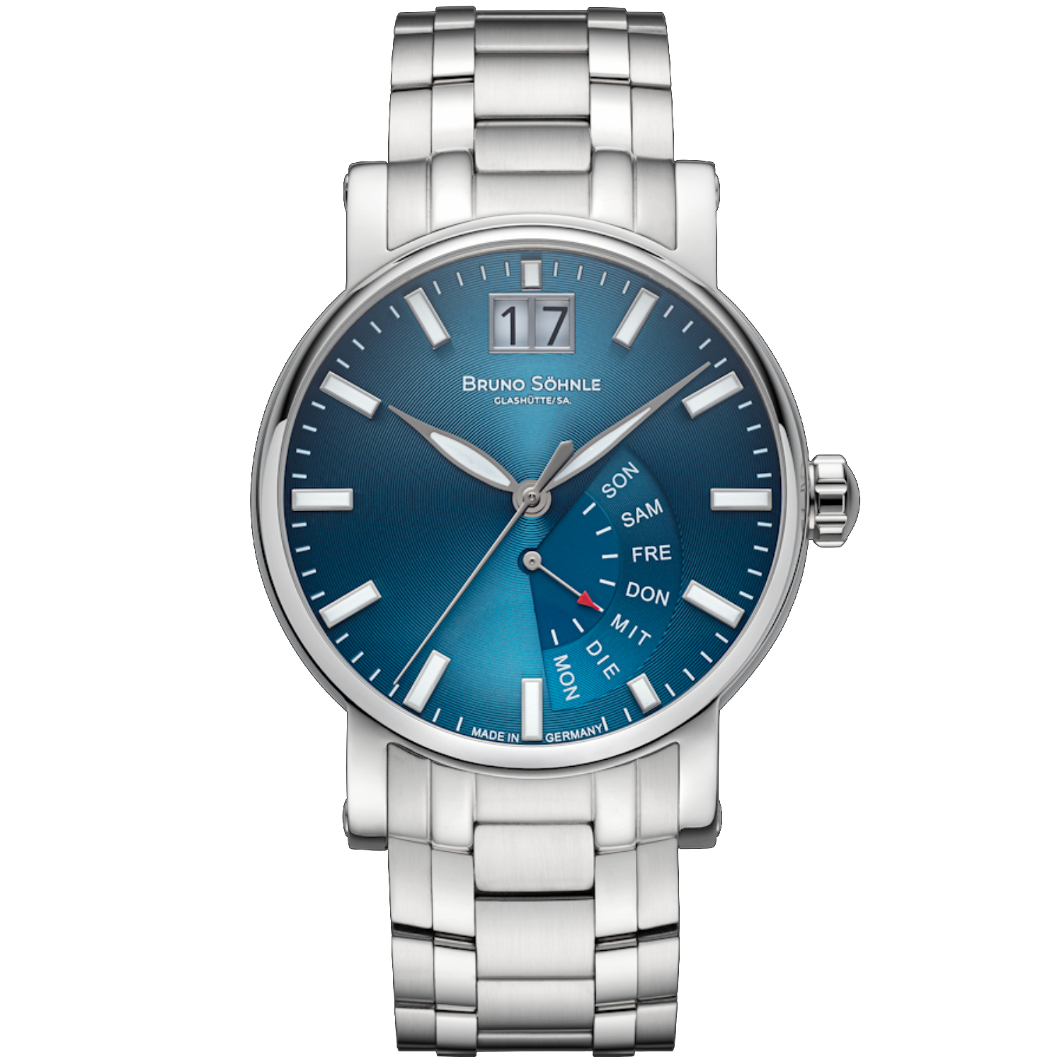 Ozeanblau und Edelstahl – eine ausdrucksstarke Kombination, die Tradition und Moderne verbindet. Das prägnante Großdatum und die raffinierte Wochentaganzeige machen die Pesaro I (2025) zum perfekten Begleiter für jede Gelegenheit.