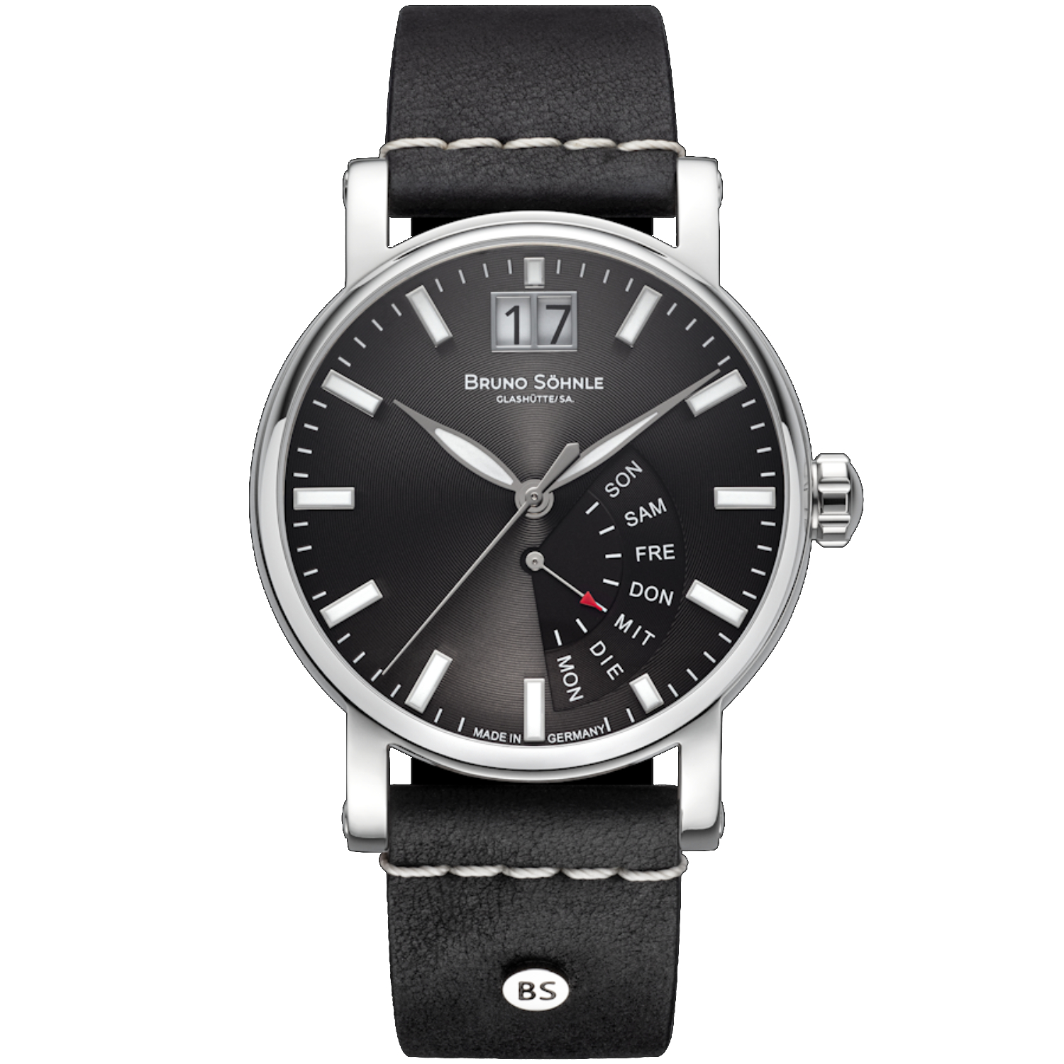Die Pesaro I (2025) in Schwarz vereint minimalistisches Design mit klassischer Uhrmacherkunst. Das Großdatum und die asymmetrische Wochentaganzeige fügen sich nahtlos in das puristische Zifferblatt ein, während das Vintage-Lederband zeitlose Eleganz unterstreicht.