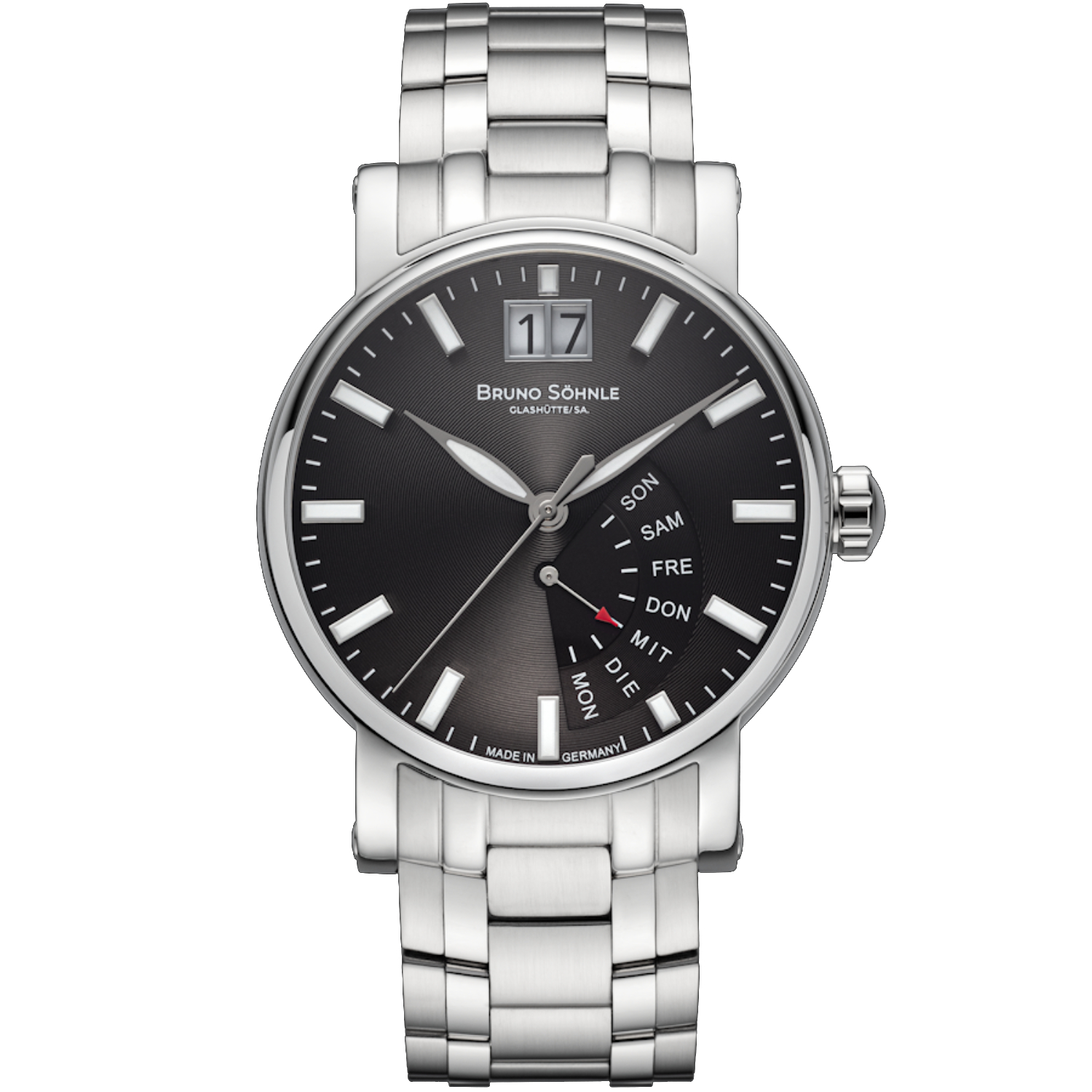 In Schwarz und Edelstahl präsentiert sich die Pesaro I (2025) als Inbegriff moderner Zurückhaltung. Großdatum und Wochentaganzeige setzen feine Akzente, während das Edelstahlarmband Robustheit und Stil perfekt kombiniert.