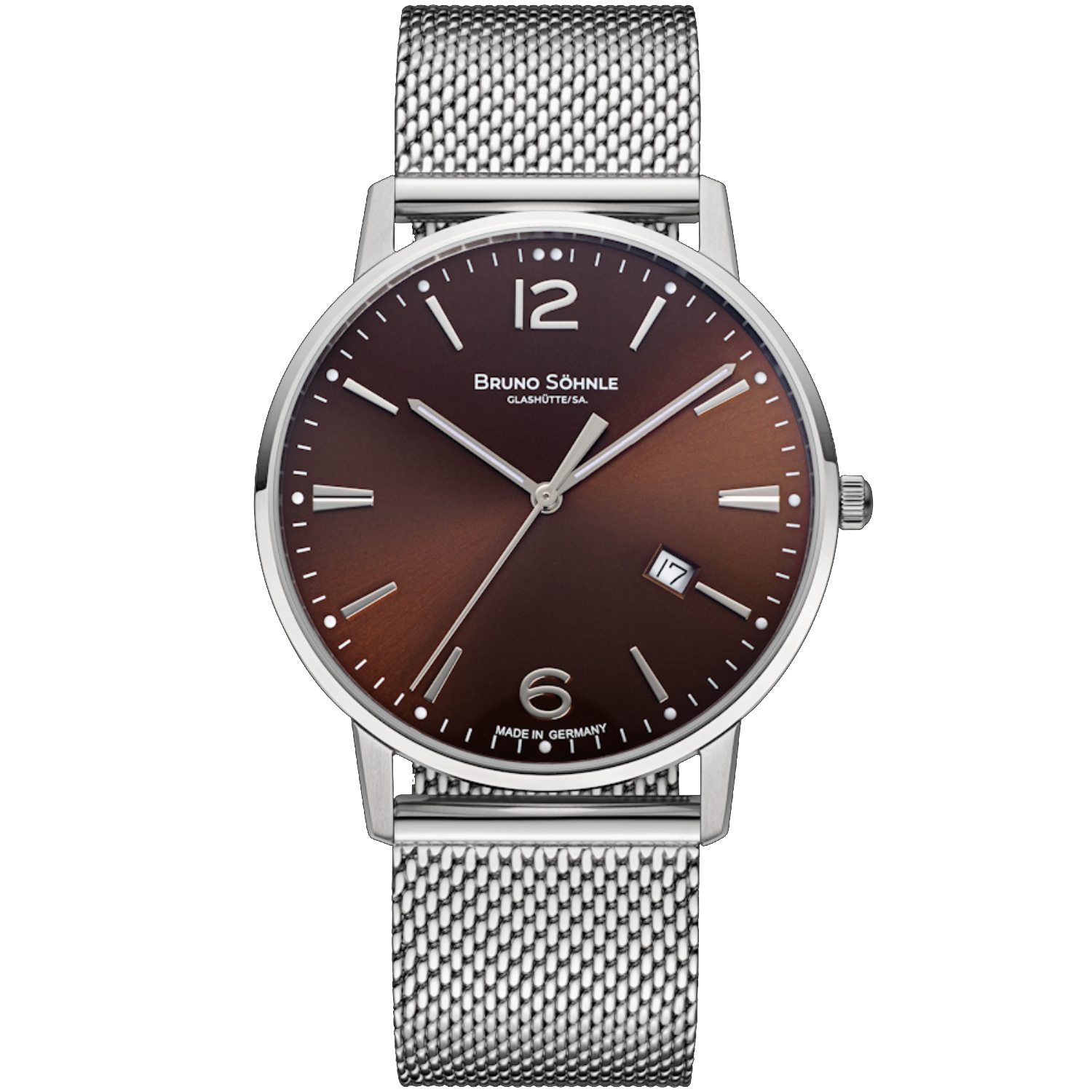 Braun trifft auf das feine Geflecht des Milanaisebands: Diese Kombination macht die Stuttgart III Big zu einem edlen Begleiter für Alltag und besondere Anlässe. Eleganz und Funktionalität verschmelzen zu einem zeitlosen Meisterwerk.
