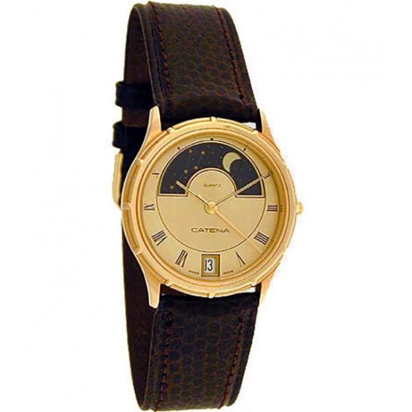 Diese patentierte Spezialitäten von CATENA® sind die einzigen Armbanduhren mit Mondphasenanzeige, die sowohl die auch noch die aktuelle Positions des Mondes anzeigt. Mondphasenuhren zum Aktionspreis Schweizer präzisions Quartzwerk (⬈ Gebrauchsanweisung), patentierte Mondphasenanzeige, champagne Zifferblatt (gelblich koloriert) mit römischen Zahlen, Datumsanzeige (6h), elegante Stabzeiger (vergoldet), vergoldete Zentral-Sekunde (ausgewuchtet), EOL (Batterieendeanzeige)!Dekoriertes Metallgehäuse (vergoldet), geschützte Flanken, Edelstahlboden (Pressitz), gehärtetes Mineralglas (flach), flaches Kalbslederband mit Reptilprägung, Dornschliesse (vergoldet)Die dunkelblaue mit einer Sternenkarte versehene Mondphasenscheine zeigt sowohl, die Mondphase als auch die genaue Position des Mondes an (Mondzenith). Ist der Mond am Himmel nicht sichtbar, wird er schraffiert angezeigt.Echtleder:Die für Leder charakteristische Beschaffenheit der Oberfläche macht jede Uhr zu etwas ganz Besonderem. Leichte Farbabweichungen zum Bild sind daher nicht auszuschliessen.3 ATM wasserdicht nach DIN(nicht zum Schwimmen geeignet)Ø: 32 mm, h: 7 mm2 Jahre GarantiePreis inkl. original Box, GebrauchsanweisungPflegetippsBleibt die Uhr stehen, sollte sie sofort zum Fachgeschäft gebracht werden, damit sie kontrolliert und eine evtl. leere Batterie weder in der Uhr noch in der Umwelt Schaden anrichtet (Auslaufgefahr). Der Batteriewechsel sollte regelmässig im Abstand von 1½ bis 3 Jahren im Fachgeschäft durchgeführt werden. Gegebenenfalls wird auch der Stromverbrauch und der Zustand der Dichtungen überprüft. Das Lederband Ihrer Uhr ist ein Verschleissteil. Naturprodukte nützen sich durch Feuchtigkeit, Schweiss, Chemikalien und Abrieb ab. Lederbänder sollten deshalb (wie auch aus hygienischen Gründen) je nach Tragegewohnheit alle 6-12 Monate erneuert werden. Beim Wechsel werden auch die Haltestifte (Federstege) überprüft und allenfalls ausgetauscht. Schweizer NOS Uhren % SALE AKTION: Original Schweizer New Old Stock Uhren. NOS = Neuwertige alte Lageruhren – Nur solange Vorrat! Diese Catena Uhren wurden in unserem Atelier fachgerecht gelagert. Kleine Kratzspuren sind nicht ganz auszuschliessen. Ungetragene Armbanduhr mit Garantie vom Schweizer Uhrmacher. Die Uhr kann gerne vor einer Kaufentscheidung besichtigt, und auch vor Ort abgeholt werden. Portofreie Lieferung. Montres CATENA Suisse Zuverlässige Qualitätsuhren einer Schweizer Traditionsmarke. Herr Willy Lebet hat 1947 die Uhrenproduktion in La Chaux-de-Fonds gegründet. La Chaux-de-Fonds, ist die höchstgelegene Stadt Europas und war über 100 Jahre lang das weltweite Zentrum der Uhrenindustrie. Die drittgrösste Stadt der Westschweiz liegt auf rund 1000 Metern über Meer ist die Geburtsstätte des Architekten Le Corbusier und gilt neben Genf als Wiege der Uhrmacherei. Die Stadt ist auch bekannt für das Uhrenmuseum MIH, das internationale Uhrenmuseum “Musée International de l’Horlogerie”, das ganz der Geschichte der Zeitmessung gewidmet ist. 1959 übernahm Claude Lebet die Leitung der Catena Uhrenfabrikation und eröffnete in Bulle einen neuen Fabrikationsstandort. International bekannt wurde Montres Catena 1972 bei der Lancierung der von André LeMarquand entworfenen ⬈ Spacemen Uhren. Neben der Spacemen kreierte LeMarquand auch für andere Marken diverse Uhren und machte sich später selbständig. Bekannt sind auch seine ergonomisch interessanten Side Watch Uhren, die auf der Seite des Handgelenktes getragen wurden. Die futuristischen Spacemen Uhren, die übrigens auch im Museum of Modern Art in New York zu sehen sind, waren in den 70er Jahren derart aussergewöhnlich, dass Catena aufgrund des durchschlagenden Erfolges innert weniger Jahren eine feste Grösse in der Uhrenfabrikation wurde. Catena hat auch Uhren für diverse andere Marken wie Fortis, Jules Jürgensen, Krieger, Nina Ricci, Tressa und Zeno hergestellt. Heute werden die Uhren von NTH, Nouvelles Techniques Horlogères SA in Corcelles im Kanton Freiburg hergestellt und produzieren Armbanduhren im Hufeisenstil oder die Swiss Space watches. Diese New Old Stock Uhr wird von ZENO-WATCH BASEL vertrieben. Wenn Sie dieses Modell anschauen möchten, Ihnen es aber nicht möglich ist, uns vor Ort in Basel zu Besuchen, können Sie sich diese Armbanduhr (sofern noch lieferbar) auch an ein Zeno Fachhändler in ihrer Nähe liefern lassen. Schnell zugreifen! Von den Schweizer Uhren wurden lediglich eine begrenzte Stückzahl hergestellt. Diese Modell wird nicht mehr produziert. Aktion gilt nur, solange der Vorrat reicht!
