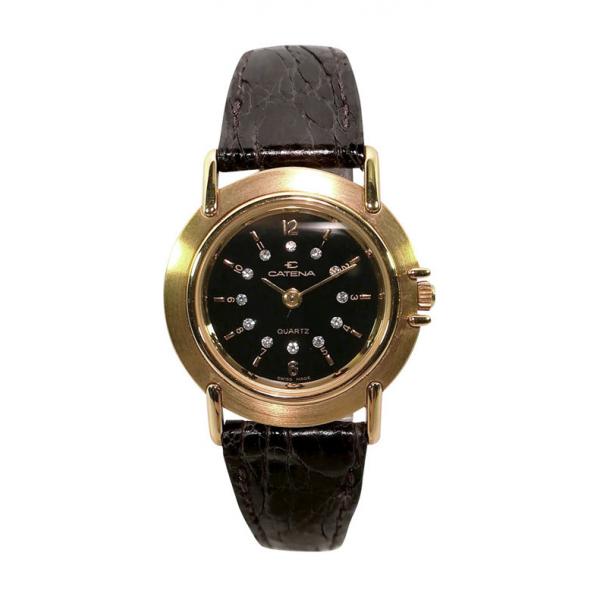 Die Schweizer Uhrmarke Catena steht für modisches Design und höchste Qualitätsansprüche. Der moderne Stil der Uhren sowie das urbane Design sorgt für Inspiration. Extraflache Damenuhren Schweizer präzisions Quartzwerk (ETA) -schwarzes Zifferblatt mit Index und Zahlen (vergoldet) und weissen Similis-Steinen – feine Dauphinezeiger (vergoldet) -Extra flaches Gehäuse (vergoldet) – geschützte Flanken – Edelstahlboden (Pressitz) – gehärtetes Mineralglas (flach) – Andrazit Krokolederband (handgenäht) mit Catena-Dornschliesse (vergoldet)ETA-Werk: Low Energie – Standard Battery (-4 Jahre) Echtleder: Die für Leder charakteristische Beschaffenheit der Oberfläche macht jede Uhr zu etwas ganz Besonderem. Leichte Farbabweichungen zum Bild sind daher nicht auszuschliessen. wassergeschützt (nach DIN)(nicht zum Schwimmen geeignet)Ø: 26 mm, h: 5 mm,2 Jahre GarantiePreis inkl. original Box Pflegetipps Bleibt die Uhr stehen, sollte sie sofort zum Fachgeschäft gebracht werden, damit sie kontrolliert und eine evtl. leere Batterie weder in der Uhr noch in der Umwelt Schaden anrichtet (Auslaufgefahr). Der Batteriewechsel sollte regelmässig im Abstand von 1 ½ bis 3 Jahren im Fachgeschäft durchgeführt werden. Gegebenenfalls wird auch der Stromverbrauch und der Zustand der Dichtungen überprüft. Das Lederband Ihrer Uhr ist ein Verschleissteil. Naturprodukte nützen sich durch Feuchtigkeit, Schweiss, Chemikalien und Abrieb ab. Lederbänder sollten deshalb (wie auch aus hygienischen Gründen) je nach Tragegewohnheit alle 6-12 Monate erneuert werden. Beim Wechsel werden auch die Haltestifte (Federstege) überprüft und allenfalls ausgetauscht. Catena Swiss NOS Uhren Hochwertiges Schweizer Uhren Design aus Gruyère. Einzigartig in ihrer Art, zeigt CATENA seit 1947 die Zeit immer wieder von einer anderen Seite. Das Design der zuverlässigen Uhren ist elegant und gleichzeitig zeitlos. Ganz gleich ob zur Jeans oder zum Anzug. Elegante, klassische Armbanduhren für Menschen mit exklusivem Geschmack.