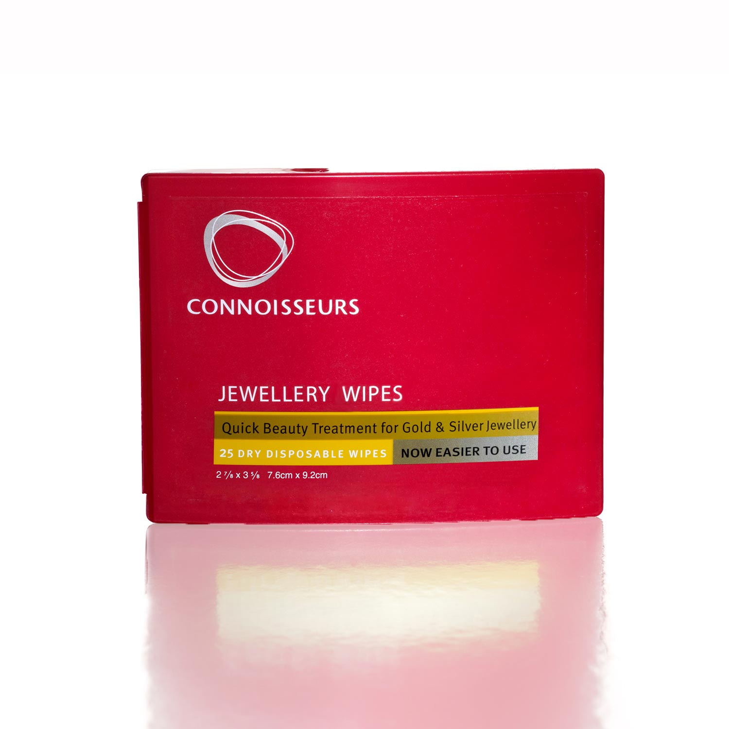 <br /><br />Connoisseurs Jewellery Wipes™ werden in einer praktischen, leicht zu öffnenden Verpackung geliefert, mit der Sie Gold- und Silberschmuck überall und jederzeit reinigen können.