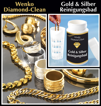 Angelaufener Gold- und Silberschmuck lässt sich mit dem Diamond Clean Gold & Silber Reinigungsbad auf einfachste Weise intensiv reinigen und pflegen.