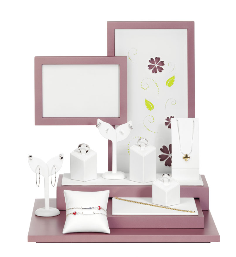 <br />Die Displays sind aus hochwertigem und robustem MDF gefertigt und teilweise mit weißem Soft-Kunstleder bezogen. Der Hintergrund besteht aus einer praktischen doppelwandigen Plexiglasscheibe, für das einfache Einfügen Ihres eigenen Logos. Die mit Blumen abgesetzte Hintergrundfläche besteht ebenfalls aus High-Gloss Plexiglas und ist mit Blumen Ornamenten in 3D-Optik verziert.